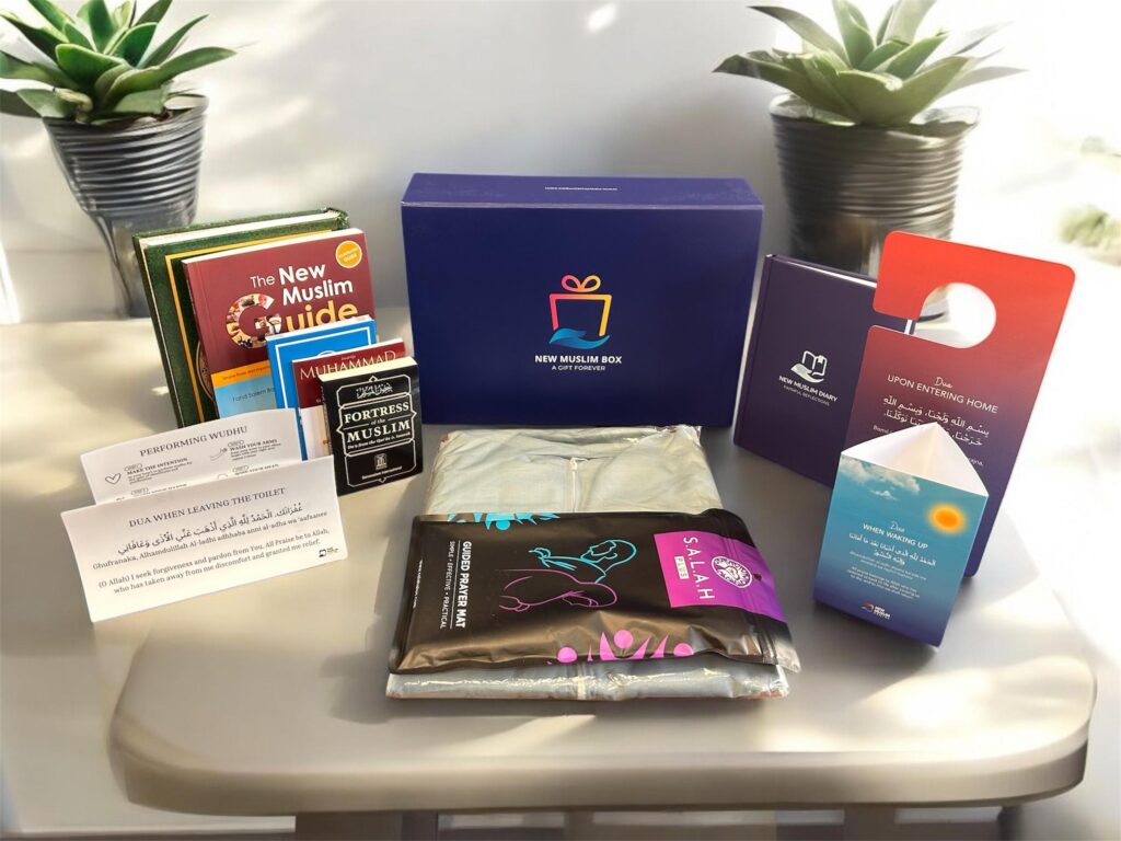 The box includes essential items such as a translated Qur’an, a New Muslim guidebook, prayer mat, prayer clothing, a 40-day diary for reflection, Duaa & Wudu stickers, and Zamzam water, among others.
